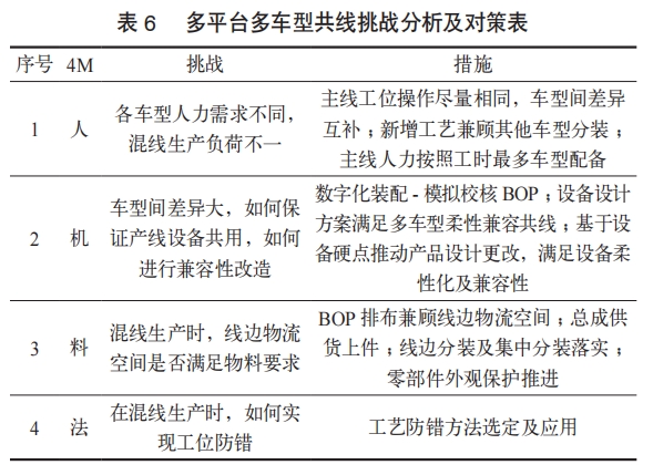 综上,多平台多车型总装共线生产会带来较大挑战,需要从“人机料法”等全面分析共线带来的影响,针对挑战制定措施对策并进行落实,多平台多车型共线挑战分析及对策见表6。