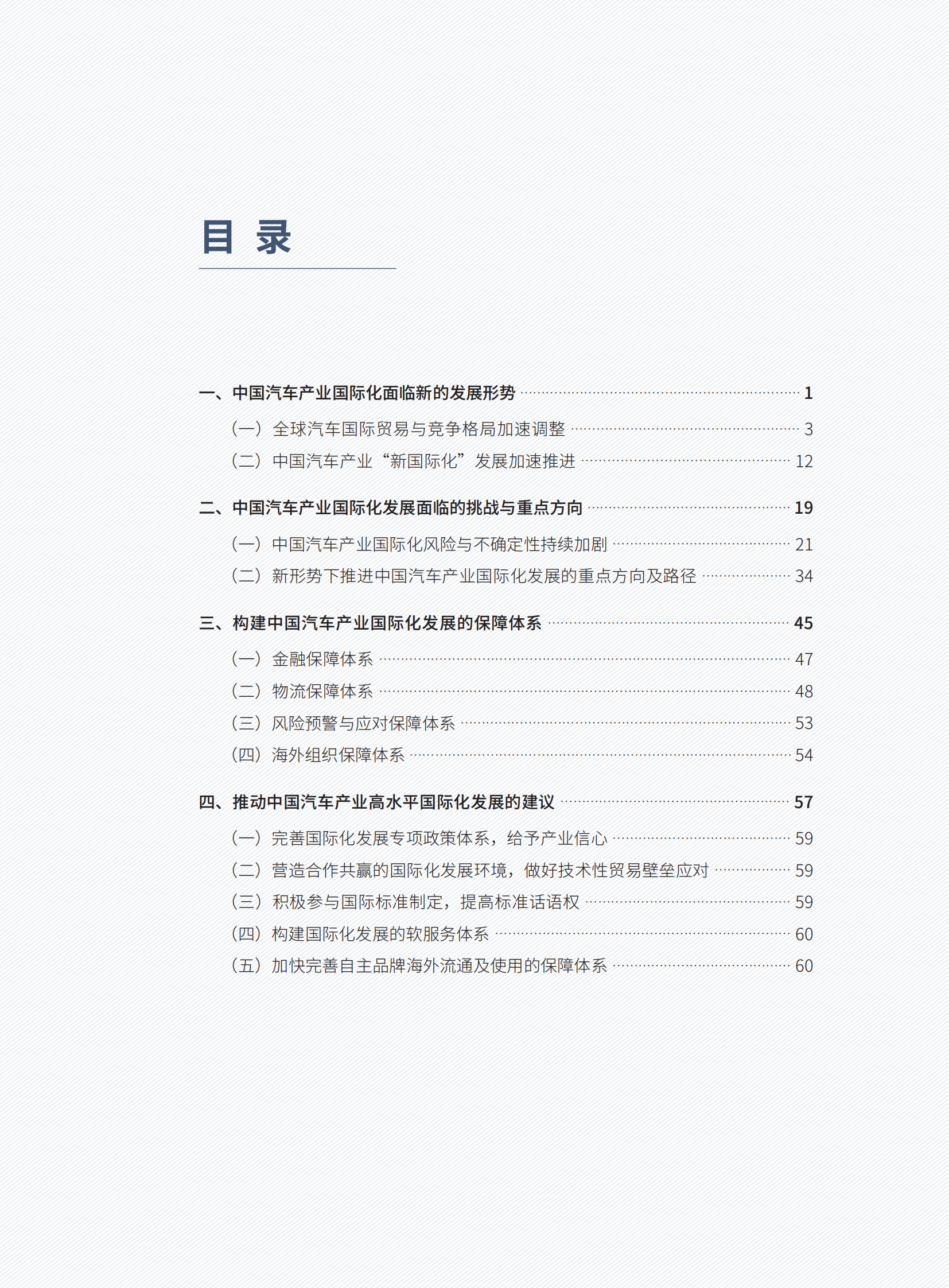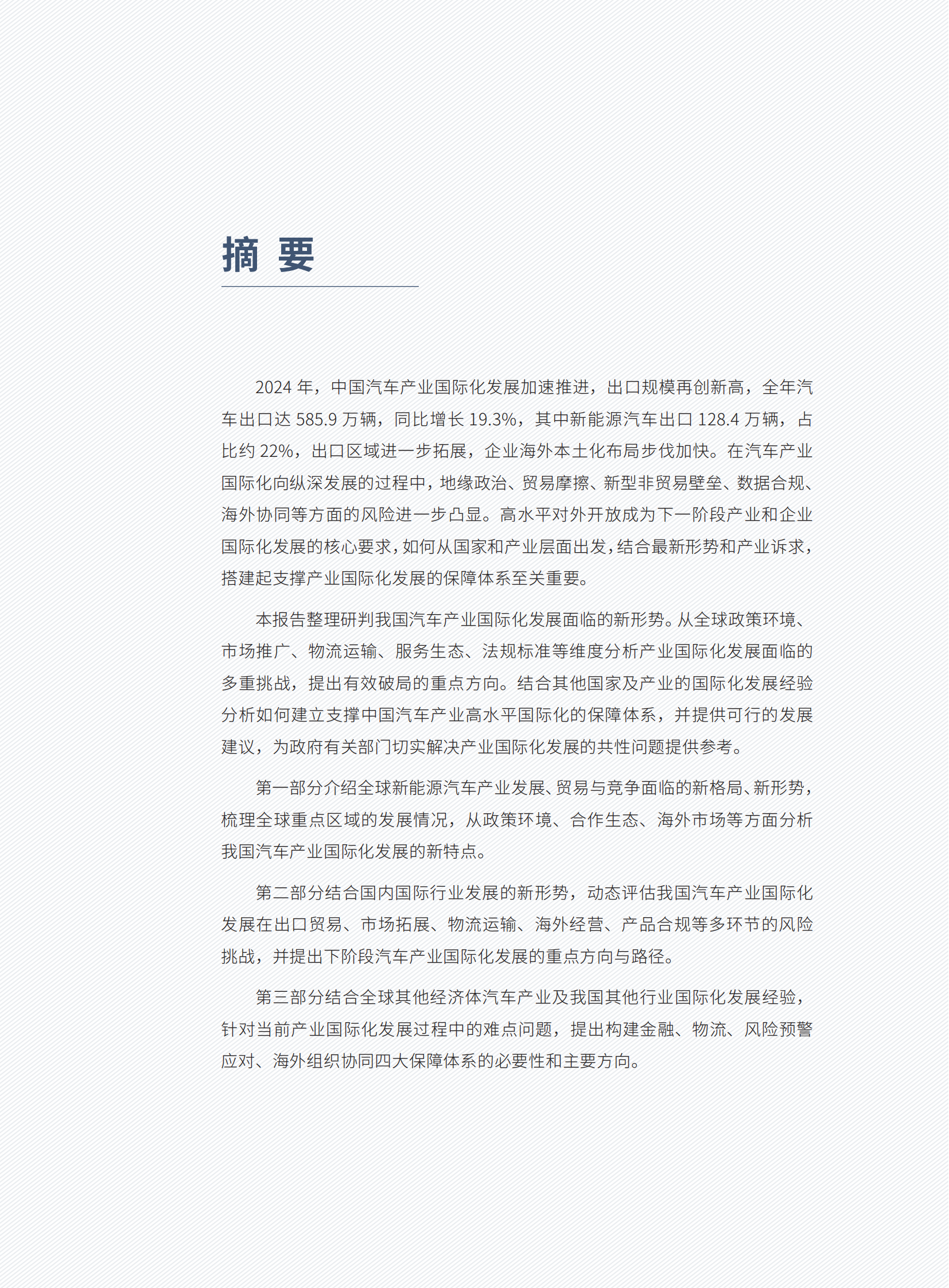 本报告整理研判我国汽车产业国际化发展面临的新形势。从全球政策环境、 市场推广、物流运输、服务生态、法规标准等维度分析产业国际化发展面临的多重挑战,提出有效破局的重点方向。结合其他国家及产业的国际化发展经验分析如何建立支撑中国汽车产业高水平国际化的保障体系,并提供可行的发展建议,为政府有关部门切实解决产业国际化发展的共性问题提供参考。