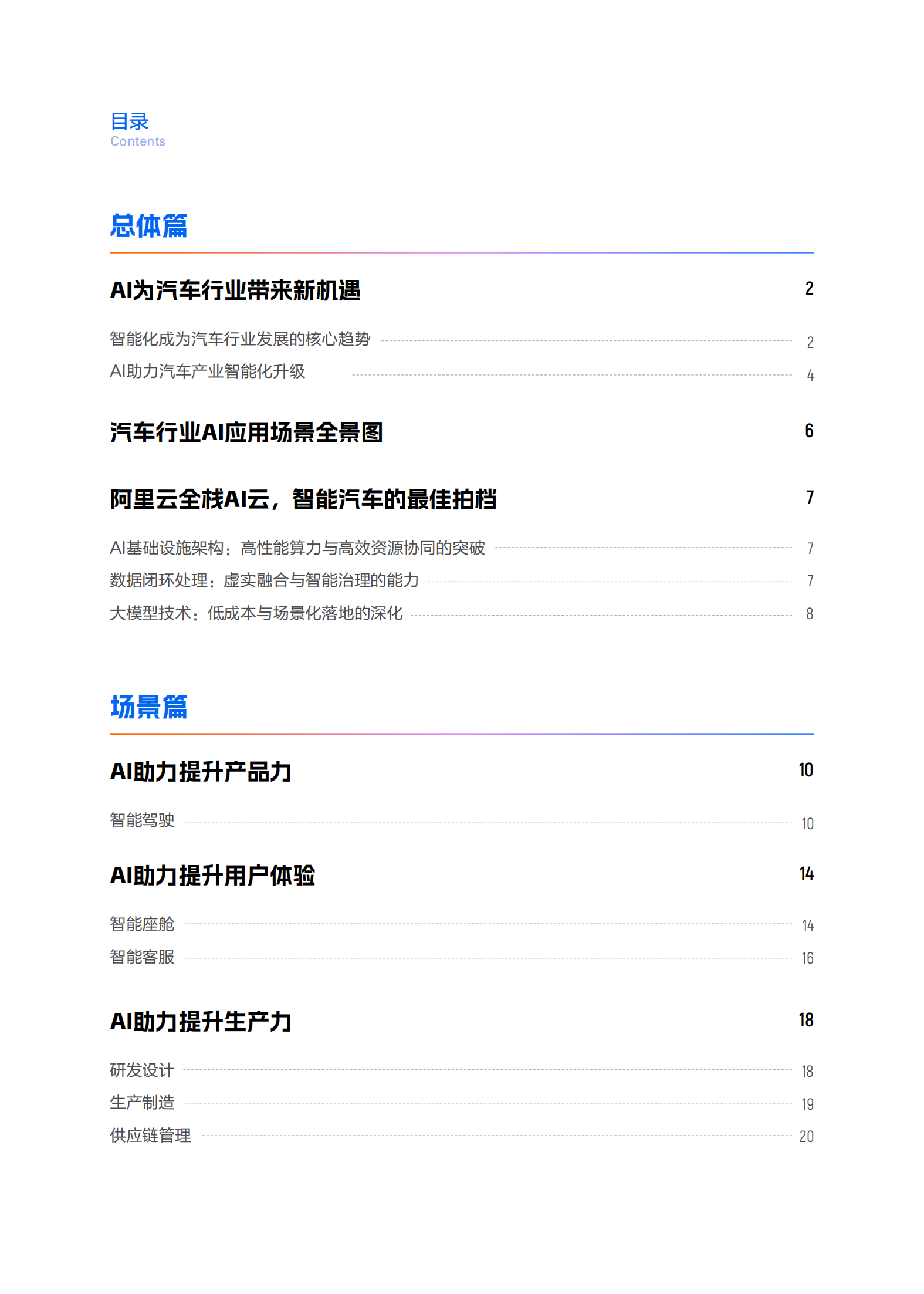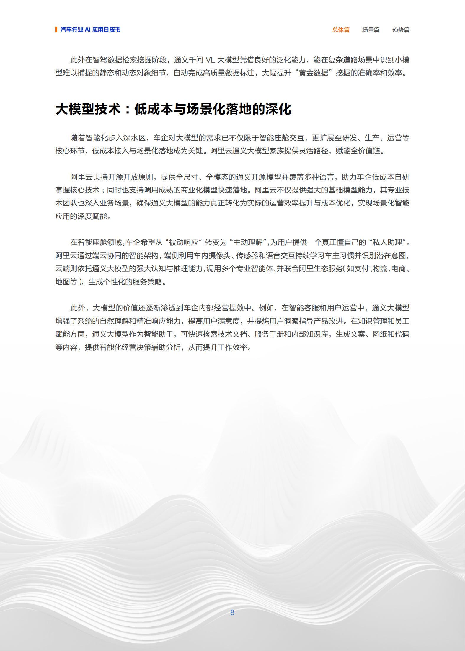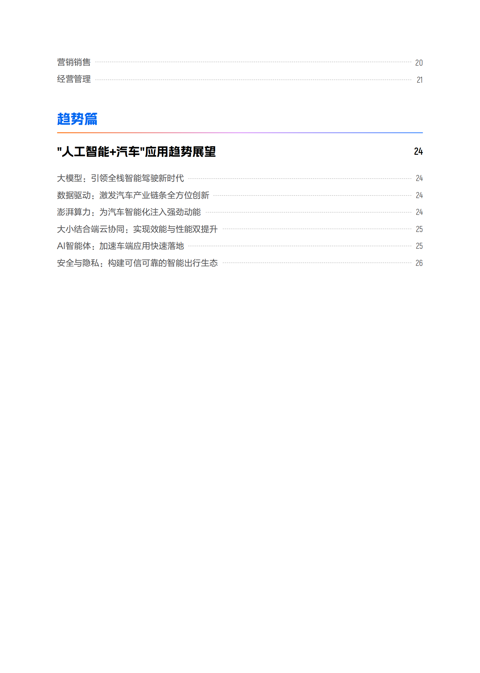 本白皮书旨在全面且深入地剖析人工智能在汽车行业的多元化应用场景、价值成效以及未来发展的前景。通过对核心应用领域的详细阐述,展示人工智能技术如何为汽车赋予全新的能力和价值;深入探讨其在提升汽车产品竞争力优化用户体验、增强车企内部运营效率等方面所带来的创新应用场景及其发挥的关键作用;并对汽车行业在人工智能时代所面临的发展趋势进行前瞻性思考与展望。本白皮书期望为汽车行业从业者、相关研究人员以及关注汽车产业发展的各界人士提供具有重要参考价值的信息,助力汽车行业在智能化进程中稳健前行,共同开创智能汽车的新时代。