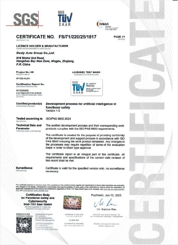 全球车企第一家!吉利荣获道路车辆安全与人工智能(ISO/PAS 8800)国际权威认证。