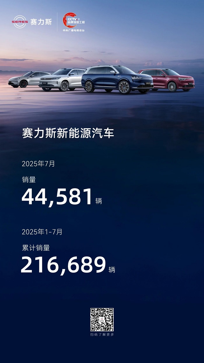 8月7日,赛力斯发布7月产销快报。数据显示,赛力斯新能源汽车7月销量44,581辆,今年1-7月累计销量达216,689辆。