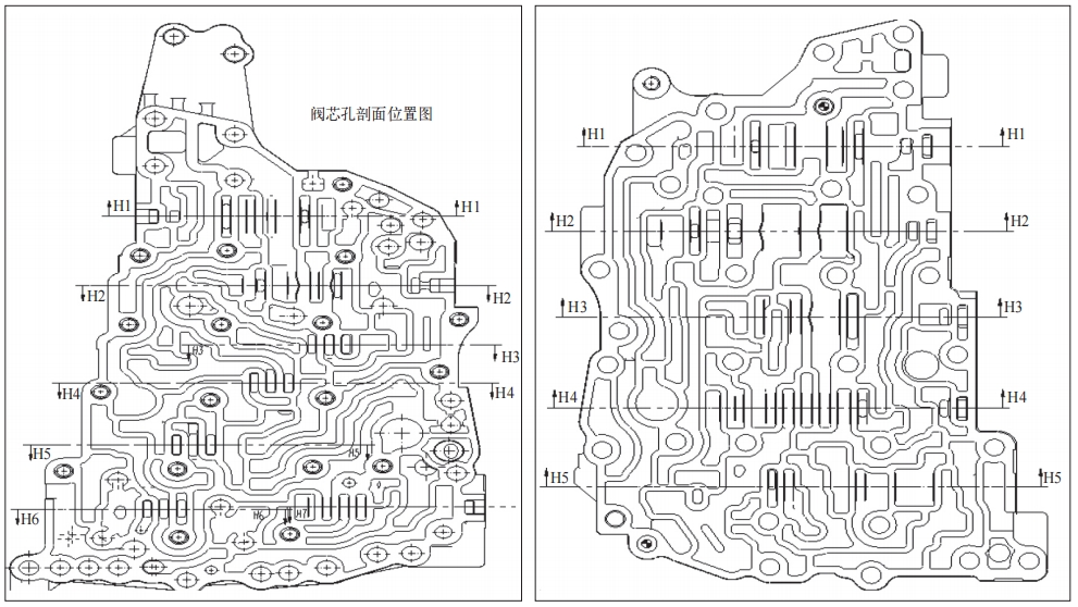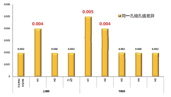 (2)同一阀芯孔孔径检测三段尺寸差异较大,其中上阀体H1孔,下阀体H1、H2这3个φ17mm孔径缩孔值差异平均达到0.004mm;从现场实际检测数据观察,同一个孔存在头尾孔径大,中间孔径小的现象(原机型阀体阀芯孔检测也有此类现象)。