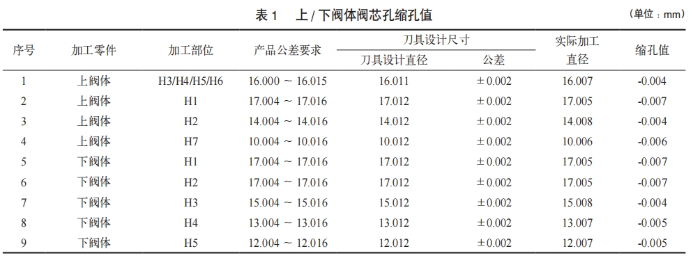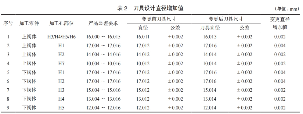 通过加工现场数据收集与验证,经产品、工艺最终确认,变更阀芯孔刀具设计尺寸,其中上阀体H1孔及下阀体H1、H2孔直径增加0.004mm,其他孔均增加0.002mm,见表2。