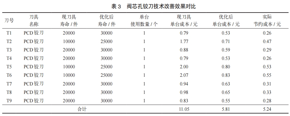 根据方案实施结果跟踪,其中缩孔值改善前后对比下降约0.003mm,同一孔缩孔值改善前后对比下降约0.002mm,刀具寿命改善前后对比整体提高约10000件~15000件。最终实现,阀芯孔9把刀具单台成本由11.05元降低到5.81元,单台节约5.24元。