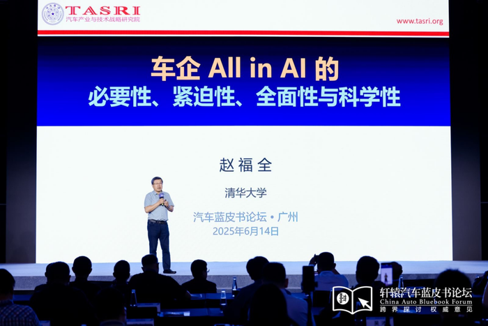 2025年6月14日,广州,在主题为“决断”的第十七届轩辕汽车蓝皮书论坛上,世界汽车工程师学会联合会(FISITA)终身名誉主席,清华大学车辆学院教授、汽车产业与技术战略研究院院长赵福全受邀出席,并发表了《车企All in AI的必要性、紧迫性、全面性与科学性》的主题演讲。