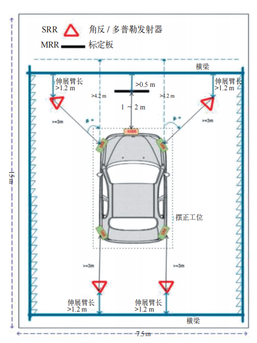 在雷达校准之前,反射板的法线与车辆行驶轴线(由非转向轮的前束角决定,和转向轮无关)的偏差值须保证在±0.15°范围内,包含水平方向及垂直方向,如图3所示。