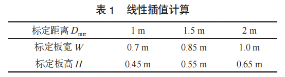 (8)标定板大小:典型值长/高=1m×0.65m@Dmrr=2m,误差<10mm;Dmrr变化时见表1线性插值计算。