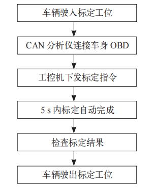 通过工控机给雷达发送标定指令,雷达进入自动标定模式,标定完毕返回标定状态,整个标定过程小于5s,若雷达标定成功,则将车辆移出标定场,下一辆车进入标定位置。若雷达标定失败或超时,则返回标定失败或标定超时字样,由人工进行干预调整并检查原因。如图4所示。