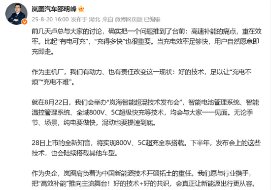 岚图汽车将于8月22日正式发布 “岚海智能超混技术”,该技术也是下半年发布新车的标配技术。其具有智能电池+智能温控+全域800V+5C超充技术,除了全新知音搭载外,接下来的追光L、泰山车型也将搭载。