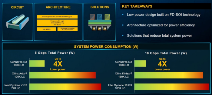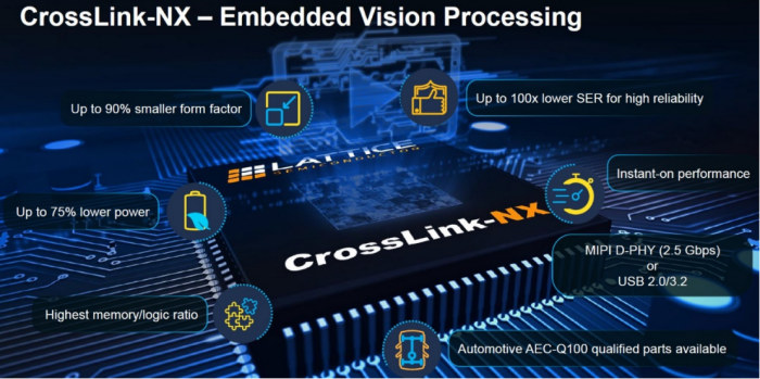 为此,CrossLink™-NX FPGA在设计时结合了28nm FD-SOI技术和优化的FPGA架构,减少了100倍的软错误率,功耗降低达75%,两个4通道MIPI D-PHY收发器硬核的速率为2.5G/Lane(10Gbps/PHY),与同行相比性能提升约2倍。采用小尺寸WLCS封装,最小仅为4mm x 4mm,比同类型产品缩小近10倍,以确保向业界呈现一款具备高度可扩展性、低价格、低功耗,且提供灵活互连、支持各种I/O标准和协议的完美解决方案。