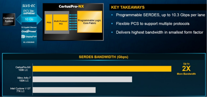 高级通用FPGA CertusPro-NX主要是为了满足智能系统中的数据协同处理、5G通信基础设施中的高带宽信号桥接、以及ADAS系统中的传感器接口桥接等创新应用需要而推出的。因此在设计上,CertusPro-NX FPGA支持多达8个可编程SERDES通道,速度高达10.3Gbps,提供同类产品中最高的系统带宽(是同类竞品FPGA的2倍之多),并支持主流的通信和显示接口,如10 Gigabit Ethernet、PCI Express、SLVS-EC、CoaXPress和DisplayPort。