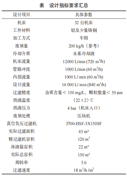 针对F4J16发动机缸体生产线切削液集中过滤冷却系统的设计,首先要考虑工厂生产的共用介质问题。工业用水应符合0.3MPa的实际情况,供电应当能够匹配三相五线的要求,另外,供气标准为0.45~0.6MPa,地坪承重为5t/m2,车间环境温度为5~40℃,水基冷却液的氯离子含量小于100x10-6,相关设备必须要能够符合共用介质的承载能力。