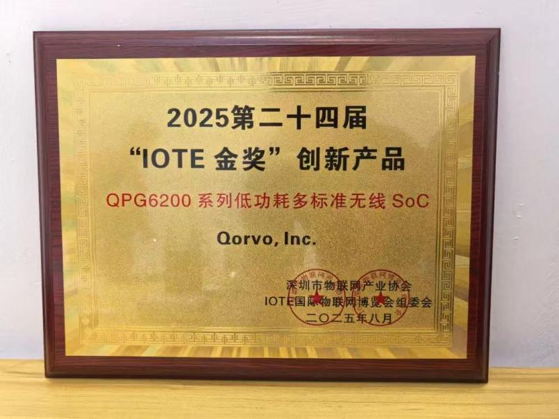 Qorvo QPG6200系列低功耗多标准无线SoC凭借出色的创新性与实用性,荣获2025第二十四届“IOTE金奖”创新产品