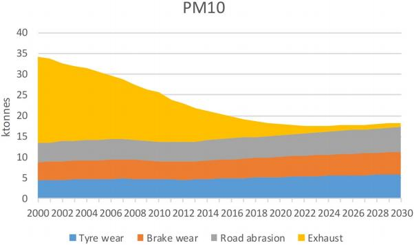随着排放法规的实施和电动汽车的引入,过去二十年来,细颗粒物 PM10 和PM2.5(分别小于 10 微米和 2.5 微米) 的尾气排放已显著下降。