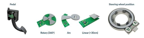 图 5 – MLX90513 三种运动类型(中) 、线控制动踏板(左) 和方向盘位置应用(右) (来源:迈来芯)