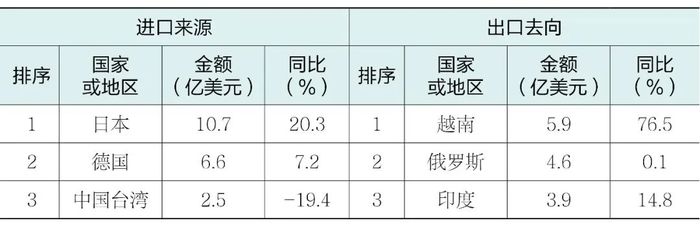 根据中国海关数据,机床工具商品进口来源和出口去向排名前三的情况,详见表5。