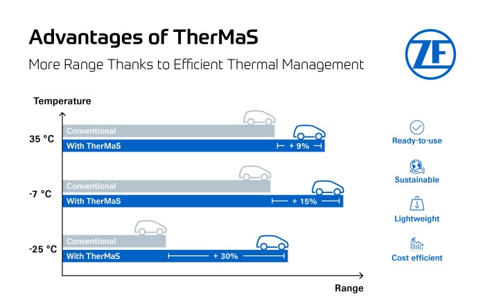 为提升电驱动效率,进而提高电动化出行的市场接受度,采埃孚采取了全面创新策略。其中之一便是TherMaS热管理系统,这是采埃孚专为纯电动车开发,已达市场成熟阶段。该系统使用丙烷作为制冷剂,在极寒和极热环境下均能实现更优的热性能,同时还使系统设计更为小巧轻便。测试结果显示,通过优化热管理以及更高效地利用驱动系统余热,该系统在严苛的冬季工况下可将电动续航里程提升10%,极端条件下甚至可提升30%。