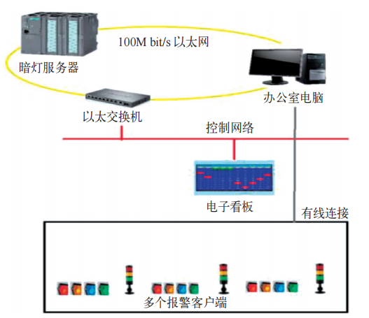 本系统的硬件由现场远程WEB客户端、办公室远程WEB客户端、现场PLC、现场I/O模块、工位呼叫按钮、工位呼叫指示灯、LED显示器及看板等构成。