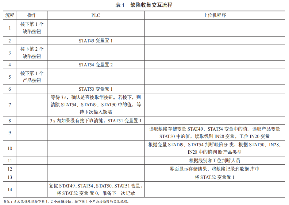 缺陷收集交互流程见表1。当操作员工发现产品缺陷时,若只有一个缺陷时,按下第一个缺陷按钮,此时PLC的STAT49变量置1;若有两个缺陷时,先按下第一个缺陷按钮,再按下第二个缺陷按钮,此时PLC的STAT54变量置2。员工按完缺陷按钮后,接着按下第一个产品按钮,此时PLC的STAT50变量置1,等待3s,确认是否按取消按钮。若按下按钮,则清除STAT54、STAT49和STAT50中的值,等待下次输入缺陷。若3s内如果没有按下取消键,则STAT51变量置1。此时上位机读取缺陷存储变量STAT49、STAT54变量中的值,读取产品变量STAT50中的值,读取线别IN28变量,工位IN20变量。根据变量STAT49、STAT54判断缺陷分类,根据STAT50、IN28、IN20中的值判断产品类型,根据线别和工位判断员工,后台管理界面显示存储结果,将缺陷记录到数据库中,完成缺陷系统中上位机软件和PLC程序的交互流程。
