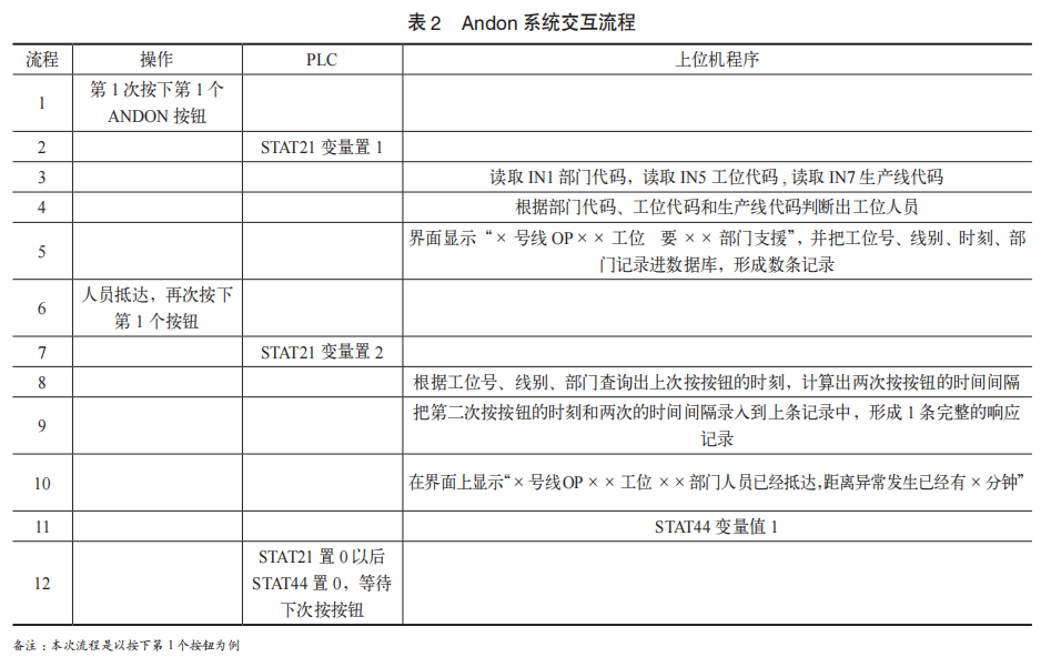 Andon系统交互流程见表2。当第一次按下第一个Andon按钮时,PLC的STAT21变量置1,上位机程序读取部门代码、工位代码和生产线代码,根据相应代码判断出工位员工,电子看板界面显示“×号线OP××工位要××部门支援”,并把工位号、线别、时刻和部门记录进数据库,形成1条记录。待工作员工抵达后,按下第二个按钮,这时PLC的STAT21变量置2,这时上位机程序根据工位号、线别及部门查询出上次按按钮的时刻,计算出两次按按钮的时间间隔,然后把第二次按按钮的时刻和两次的时间间隔录入到上条记录中,形成1条完整的响应记录。这时电子大屏在界面上显示“×号线OP××工位××部门员工已经抵达,距离异常发生已经有×分钟”,此时上位机将STAT44变量值1,STAT21置0以后STAT44置0,完成Andon系统交互流程。