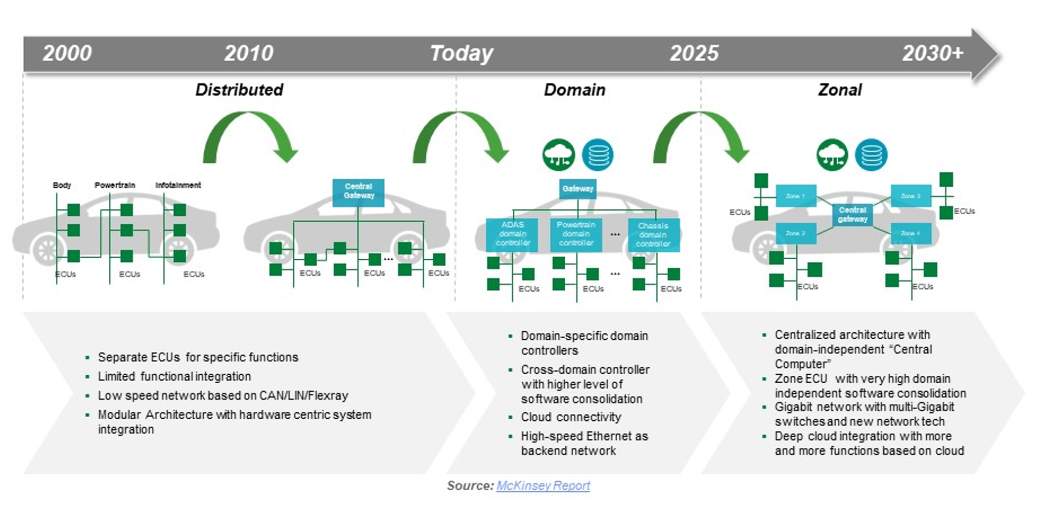 传统的分布式控制架构或基于功能集成的分布式控制系统在复杂性、大量布线和通信瓶颈等问题上已举步维艰,而分区式域控架构通过将电子控制单元(ECU)整合到几个区域(如动力域、底盘域、车身域及座舱域等)、优化功率分配、减少布线和提高系统可靠性来应对这些挑战。今天,汽车行业正处于分布式向分区式域控架构的过渡阶段,未来最终将迈入“车载中央计算”阶段。