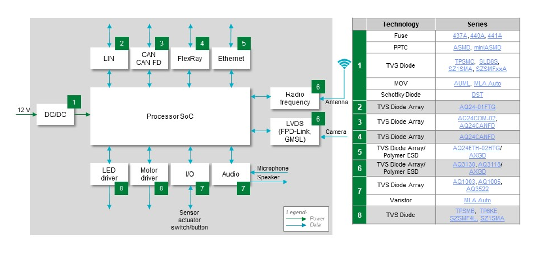 确保ZCU中的众多通信和控制接口不会在恶劣的汽车使用环境中受到损坏,对于车辆的安全运行至关重要。静电放电和瞬态电压是主要的危害能量源。ESD二极管和聚合物ESD抑制器可为通信数据线和控制线提供适当的保护。选择低电容元件以减少信号失真,使用静电放电保护解决方案,可确保在分区式域控架构内的ZCU及其连接功能之间进行可靠的数据传输。
