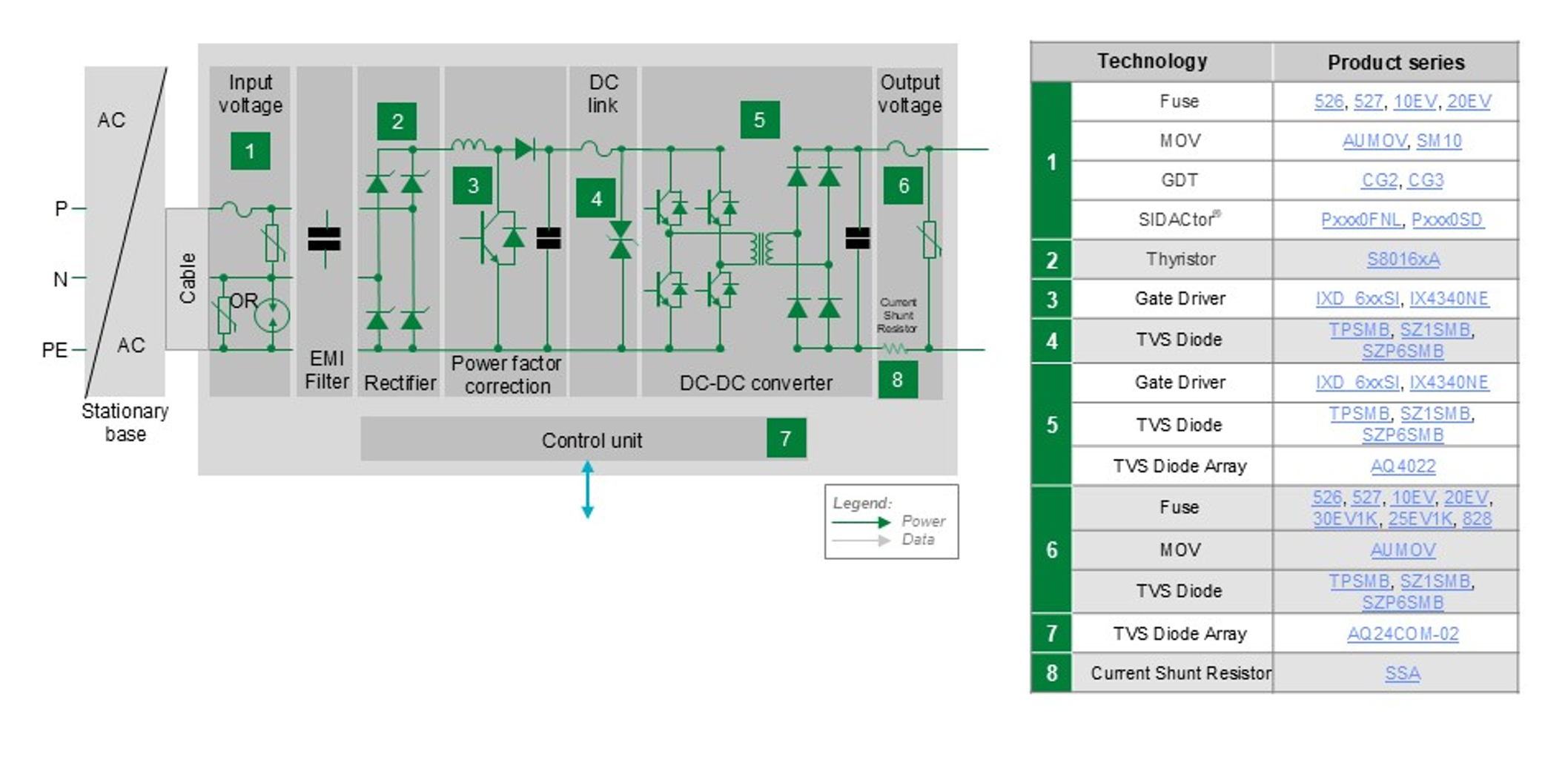 车载电池充电机将交流线路电压转换为直流电压,为电池组充电,工作电压为400-800V。图 3所示为其电路框图。随着更快、更高功率的充电(包括三相电源)成为标准配置,每个电路模块都需要保护元件,有些还需要控制元件以提高效率。