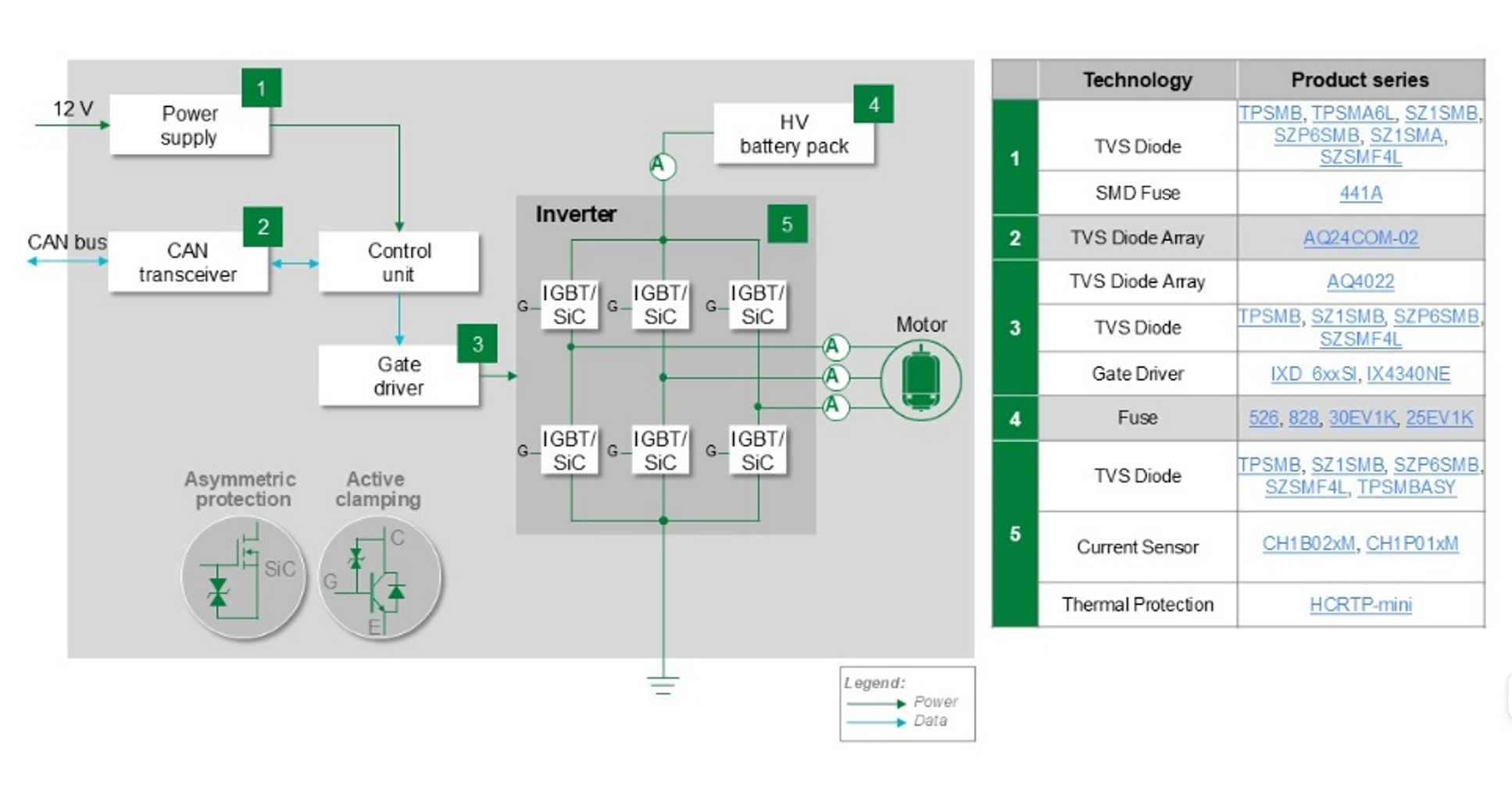 牵引电机逆变器将电池直流电转换为交流电,以驱动牵引电机。该电路模块的运行需要安全、高效和可靠的推进力。图4显示了牵引电机逆变器的电路模块,其中的表格列出了推荐的保护、控制和传感元件。