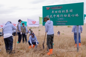 第十三届丰田纺织集团“绿色中国”沙漠锁边植树行在内蒙古阿拉善左旗举行,丰田纺织(中国)持续践行绿色行动,并将绿色理念融入产品层面的可持续材料开发与应用、轻量化设计等,对产业链乃至整个行业产生了更为深刻的影响。