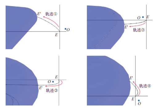 在CATIA软件中,利用DMU运动模拟机罩开启过程,记录机罩瞬心位于四个不同象限时,开启初始阶段点E的运动轨迹,得出的四种不同的轨迹如图2所示。