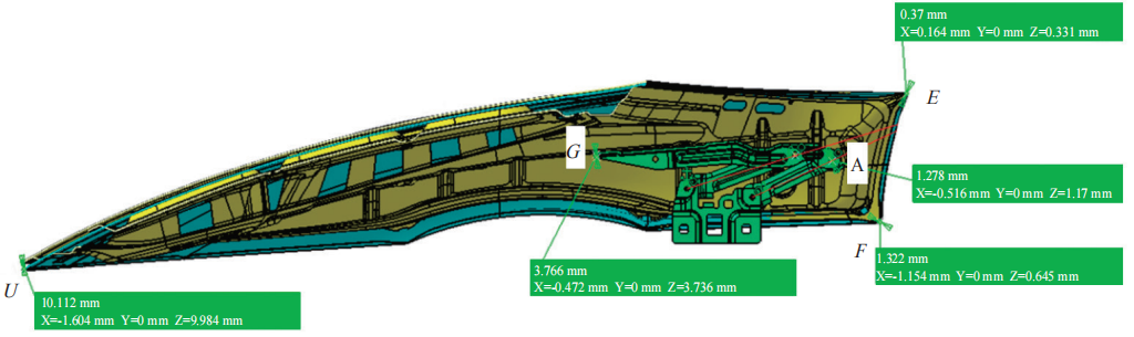 之后利用测量设备对该车型的实车机罩进行标定,将机罩开启相同高度,后部各点的位移量与理论数模的位移量统计见表。