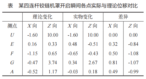 1.2 四连杆铰链机罩实物运动轨迹与理论轨迹的差异