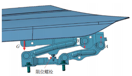 当机罩处于闭合状态时,如图4所示,铰链动臂前端受机罩重力作用被下压,此时在限位螺栓的支撑作用下,铰链动臂变成一个杠杆,转轴B作为杠杆的支点将与配合孔的上边缘接触,而转轴A则会与配合孔的下边缘接触;当机罩开启时,动臂前端会跟随机罩内板向上运动,机罩重心后移,使转轴B和转轴A产生向下的运动势。由于轴孔存在配合间隙,此时动臂在转轴A处会优先向下运动,使孔的上边缘与轴A接触,之后才会按照四连杆的理论轨迹向上运动,在此过程中,机罩后角即会产生点头动作。
