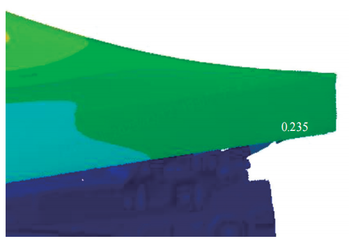 借助CAE分析软件,计算机罩开启时铰链的受力变形情况。某机罩闭合状态时,如图5所示为其后部受重力变形位移云图,数据显示铰链转轴A处的Z向变形量为-0.235mm。