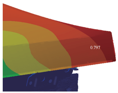 将机罩开启一个小角度后,重新进行CAE分析,机罩后部变形云图如图6所示,数据显示铰链转轴A处的Z向变形量为-0.797mm,两组数据证明机罩在开启一个小角度后铰链转轴区域变形明显增大。