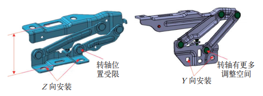 当铰链与车身的安装改为Y 向打紧时,就可以很好地解决空间不足的问题,如图7所示,常见的两种铰链安装方式,前期设计时应优先选择Y 向安装。