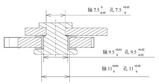 为减小因孔轴配合松动导致的机罩后角下沉量,在设计上应确保铰链转轴直径和动臂、摆臂孔的直径相同,并通过公差控制来实现过盈配合。某车型铰链轴孔尺寸的设计参考方案如图8所示。