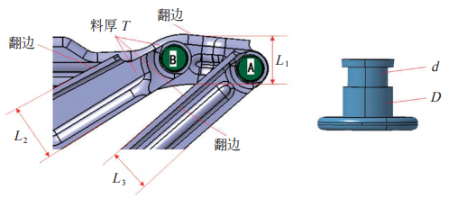 在上述试验中,我们通过CAE分析证明,机罩在开启瞬间,铰链转轴区域会发生变形。如图9所示,通过将转轴直径D、d 加粗,料厚T 加厚,动臂宽度L1、摆臂宽度L2、L3加宽,并增加翻边结构等措施,可以提高转轴区域的整体刚度。借助CAE分析,可以直观地评价铰链刚度的提升幅度。