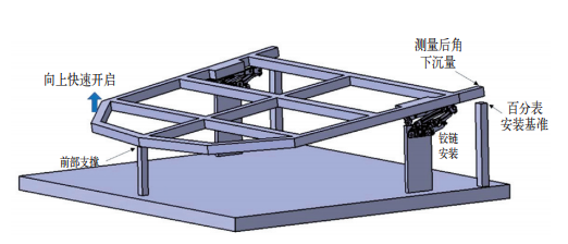 试验时,在机罩模拟框架的左后角架设百分表,然后在框架的右前角位置向上抬起机罩,观察百分表转动量,用于评价框架后角的下沉量。然后将此下沉量代入到运动校核公式中,用于判断铰链实物刚度是否满足过关要求。