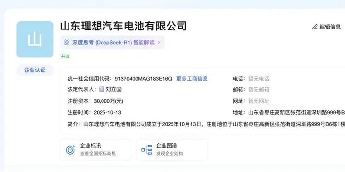 10月13日讯,据爱企查显示,山东理想汽车电池有限公司成立,法定代表人为刘立国,注册资本为3亿元,经营范围包含:电池制造;电池销售;新兴能源技术研发;集中式快速充电站;新材料技术研发;软件开发等。此前,理想宣布,理想汽车与电池厂商欣旺达将以50:50的出资比例成立合资公司,合资公司注册名为山东理想汽车电池有限公司,将用于生产理想汽车自研的动力电池产品。