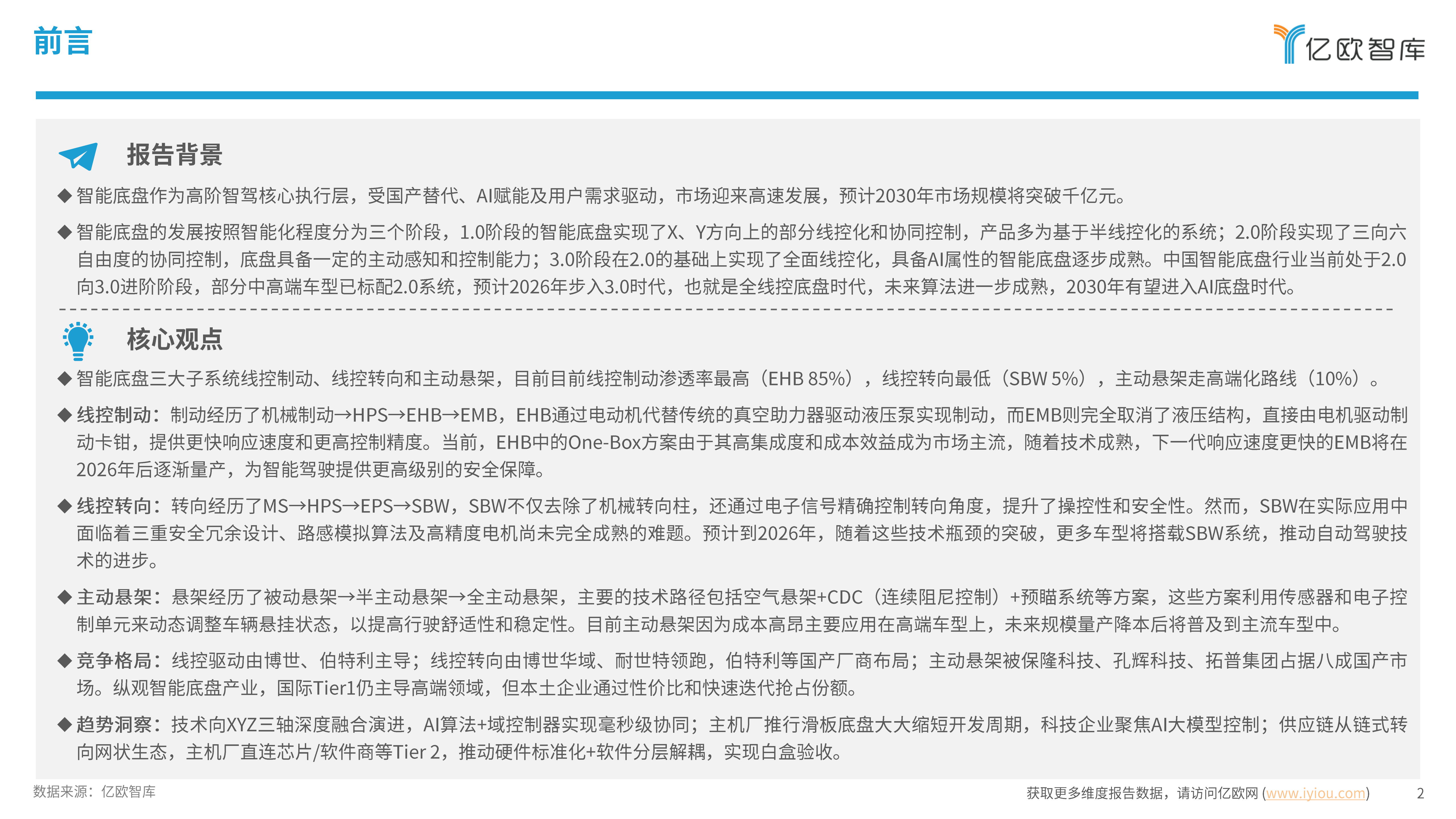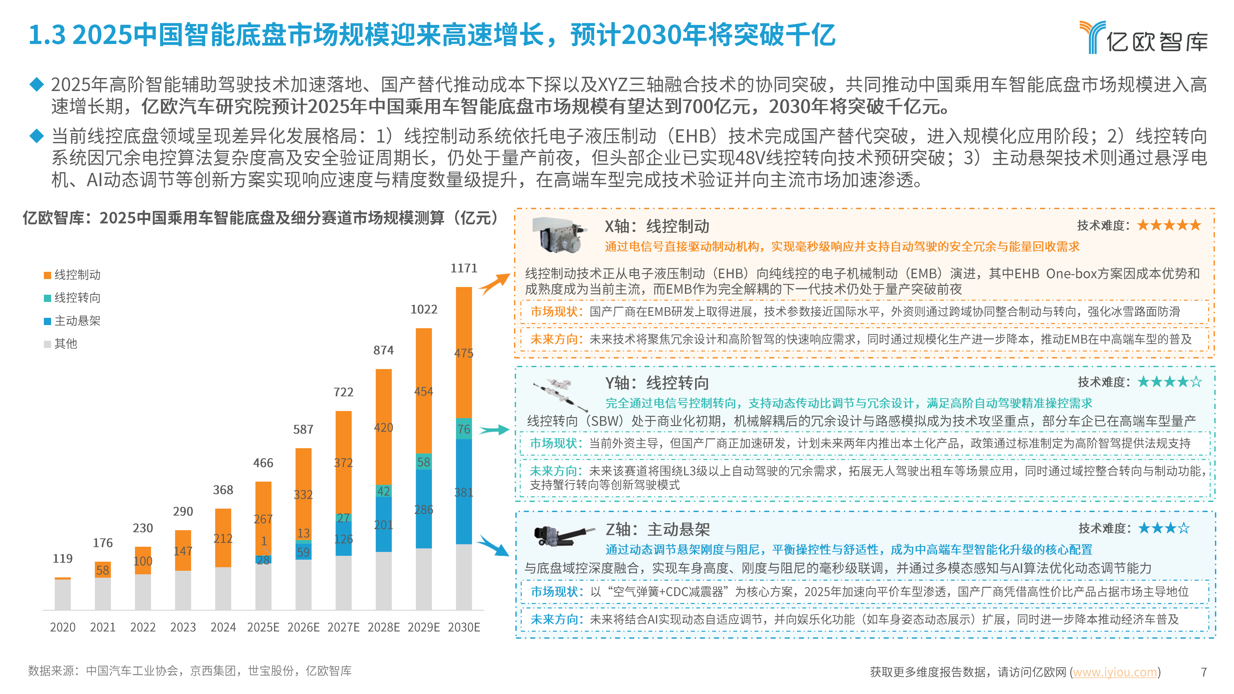◆ 智能底盘作为高阶智驾核心执行层,受国产替代、AI赋能及用户需求驱动,市场迎来高速发展,预计2030年市场规模将突破千亿元。