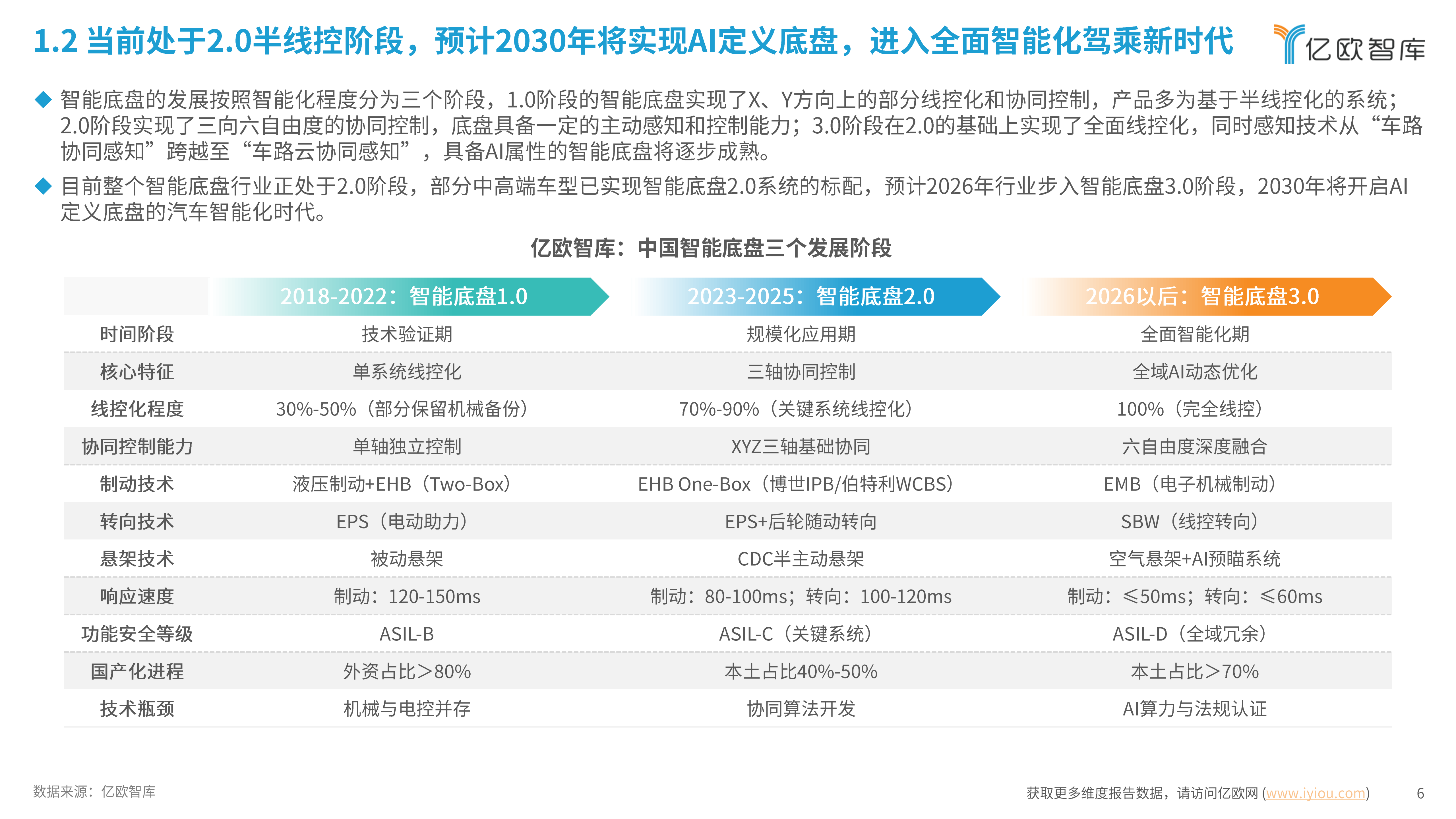 ◆ 智能底盘的发展按照智能化程度分为三个阶段。10阶段的智能底盘实现7X、V方向上的部分线控仪和协同控制、产品多为基干半线控化的系统、20阶段实现7三向六自由度的协同控制,底盘具备一定的主动感知和控制能力:3.0阶段在2.0的基础上实现了全面线控化,具备AI属性的智能底盘逐步成熟。中国智能底盘行业当前处于2.0向3.0进阶阶段,部分中高端车型已标配2.0系统,预计2026年步入3.0时代,也就是全线控底盘时代,未来算法进一步成熟,2030年有望进入AI底盘时代。
