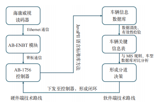 在硬件上,系统增加了自动条码读取装置,采用海康威视读码器,通过Ethernet通信协议将20位跟踪码信息传递给AB的ENBT模块,达成信息初步采集。过程包含扫描结果状态、控制字等多信息流交互。
