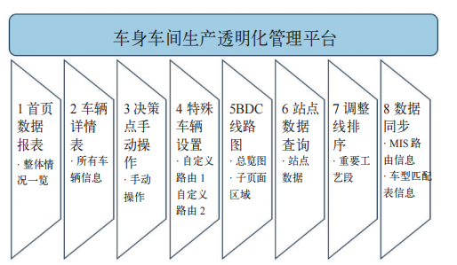 整个数字化平台依据生产线的工艺特点和应用场景,包含了数据报表、BDC路线总览、车辆详情表和手动操作页面等多个功能版块,平台架构如图2所示。