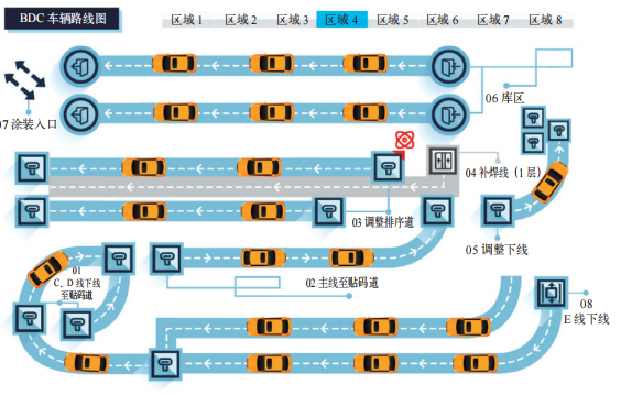 通过在BDC平台的26个关键点位部署自动扫码设备,将信息回传至服务器。通过跟踪码、过站时间和车型信息等,追踪车辆在整个BDC区域的全过程,做到真正的数字化监管。生产计划MIS部门会动态下发各跟踪码的路由规则,通过上位系统与MIS系统的关联,实现相应车辆分流的自动控制,节省人力。