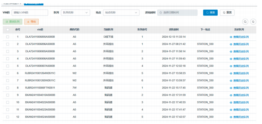 该版块以表单的形式展示所有的车辆信息数据,默认画面按车辆流向的顺序展示各个队列的车辆信息详情,包括车身跟踪码、颜色代码、当前队列、队列序号及进站时间等,将所有车辆的信息集成处理,更加高效,车辆详情表单如图5所示。