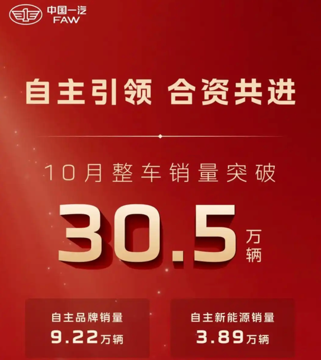 首先是在市场全面转向新能源的大环境下,转型不利的一汽集团急需打开突破口。2024年,一汽集团自主乘用车品牌红旗和奔腾合计售出新能源车不足20万辆,占集团整体销量仅6%出头;今年1—10月,一汽集团自主新能源累计销量为28.61万辆,占比也刚过10%。