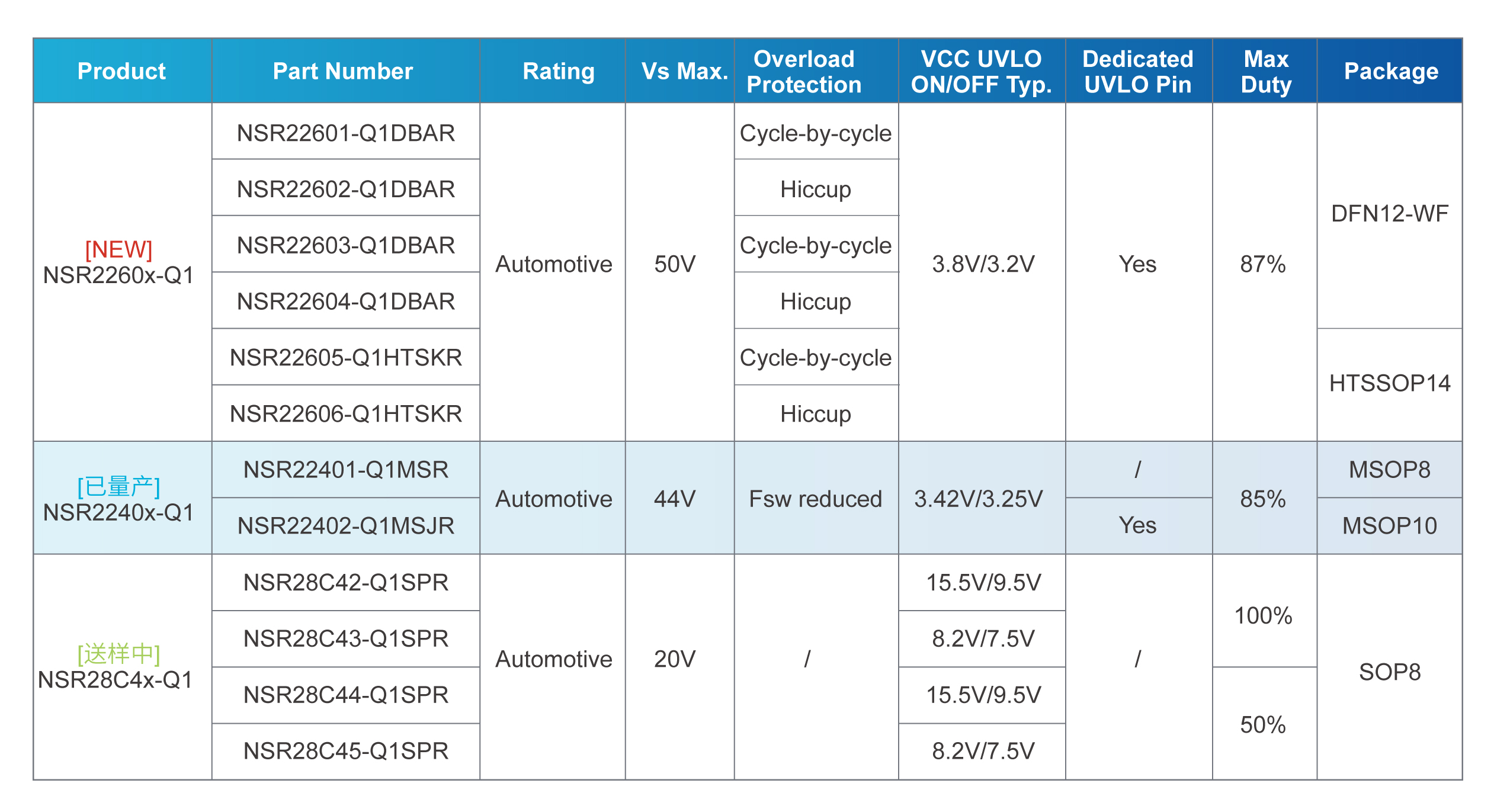 随着NSR2260x-Q1系列的推出,纳芯微进一步完善了车规级PWM控制器产品矩阵,持续强化在车载电源控制领域的技术布局。除汽车应用外,纳芯微电源管理产品亦广泛布局工业与服务器电源等场景,满足不同系统对高功率密度、低EMI与长寿命运行的严苛要求。