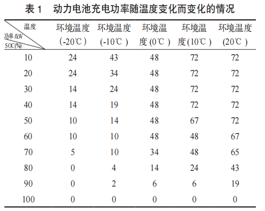 以某款电动车(磷酸铁锂电池)为例,测试其在不同温度下的充、放电功率,见表1。