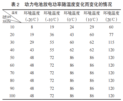 动力电池放电功率随温度变化而变化的情况见表2,在相同SOC条件下,温度越低,动力电池放电功率越小,在50%的SOC条件下,-20℃时放电功率仅为常温20℃放电功率的40%。例如,常温20℃续航里程250km的整车,在-20℃温度条件下,续航里程不超过100km。